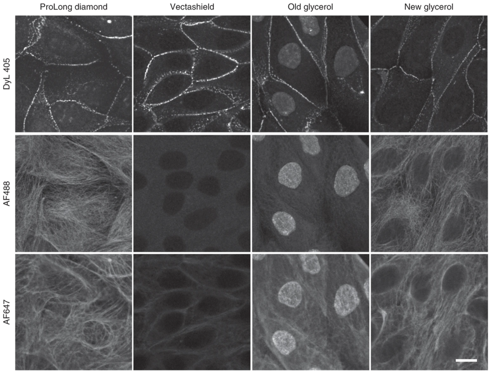 図 3 様々な蛍光色素による染色に対する封入剤の影響. Jonkman J., Brown C.M., Wright G.D et al. Tutorial: guidance for quantitative confocal microscopy. Nat Prot 15, (2020) 5 より。#