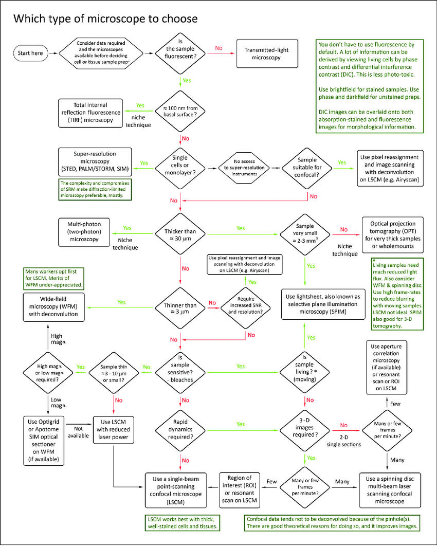 実験に適した顕微鏡を選ぶ際には、実験の目的や要件だけでなく、研究者が実際に利用可能な装置であるかや施設に設置されているかも重要な要因となります。下図は顕微鏡を選択する際に検討すべき主な判断項目を示しています(Jermey Sanderson による Fundamentals of Microscopy 14 からの引用)。さまざまな顕微鏡の長所と短所について、より詳しい解説は、Jonkman らによるチュートリアル 5を参照してください。