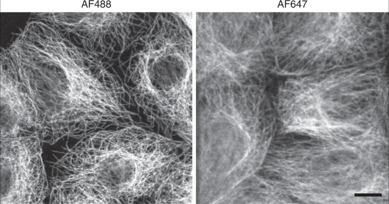 図 5 長波長の光では分解能が低下する。 短い波長の光で撮像した微小管は、より長い波長で撮像した場合と比べて高い分解能で観察される。Jonkman J., Brown C.M., Wright G.D. et al. Tutorial: guidance for quantitative confocal microscopy Nat Prot 15, (2020) より 5#